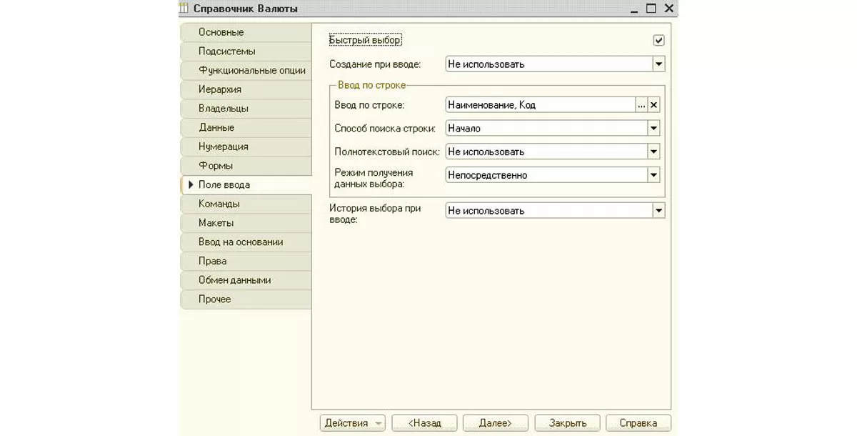 Грамотная настройка параметров на вкладке «Поле ввода» создаст пользователям максимально удобные условия в работе. Параметры «Быстрый выбор/Ввод по строке/Полнотекстовый поиск» помогут найти нужный элемент. «История выбора при вводе» сохранит ранее используемые позиции.