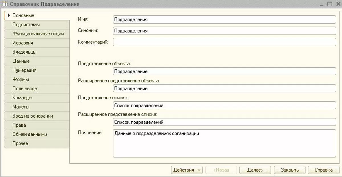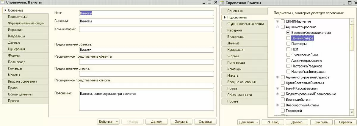 Вкладка «Основные» содержит информацию о наименовании справочника и его описании. Следующий раздел «Подсистемы» отвечает за включение справочника в конкретную подсистему.