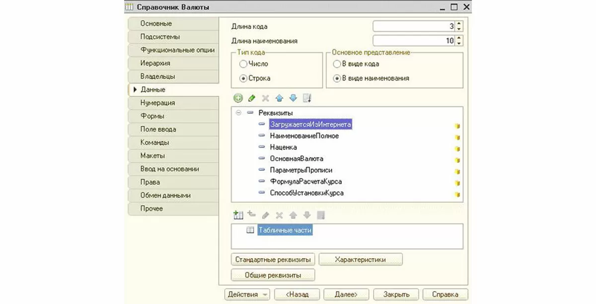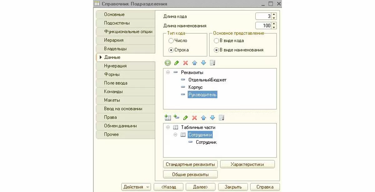 На вкладке «Данные» определяется, какую информацию вы сможете добавить в справочник 1С. Сверху настраивается код и наименование – одни из стандартных реквизитов, в центре – перечень добавленных реквизитов. В нижней части вы видите табличные части справочника.