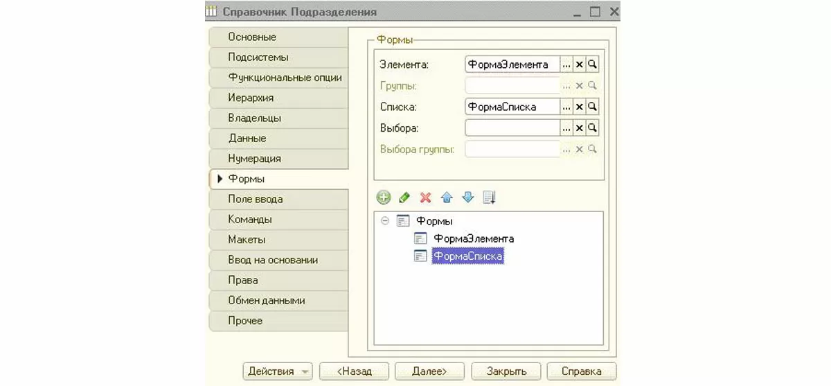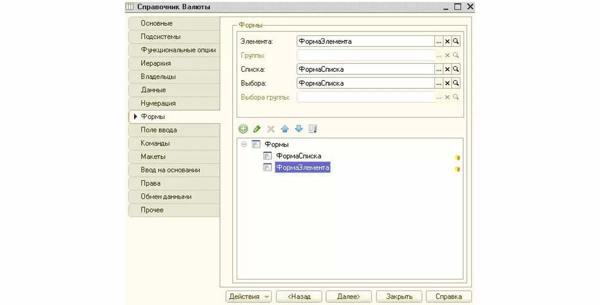 На вкладке «Формы» разработчики создают интерфейсы, которые будут видны пользователям. Чаще всего встречаются формы Элемента и Списка: так в программе 1С пользователи видят список данных справочника и его элементы.