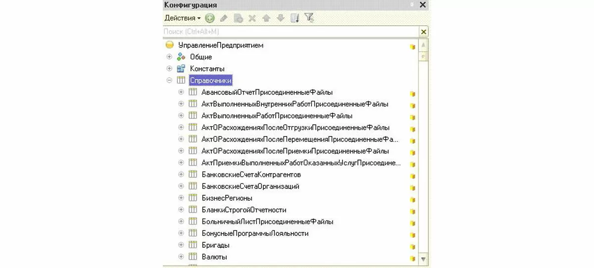 По своей структуре справочники в программе 1С представляют собой списки определенных данных. Чтобы ознакомиться с существующими справочниками в конфигурации 1С, необходимо зайти в нее в режиме конфигуратора. В дереве конфигуратора найдите ветку «Справочники» и раскройте ее.