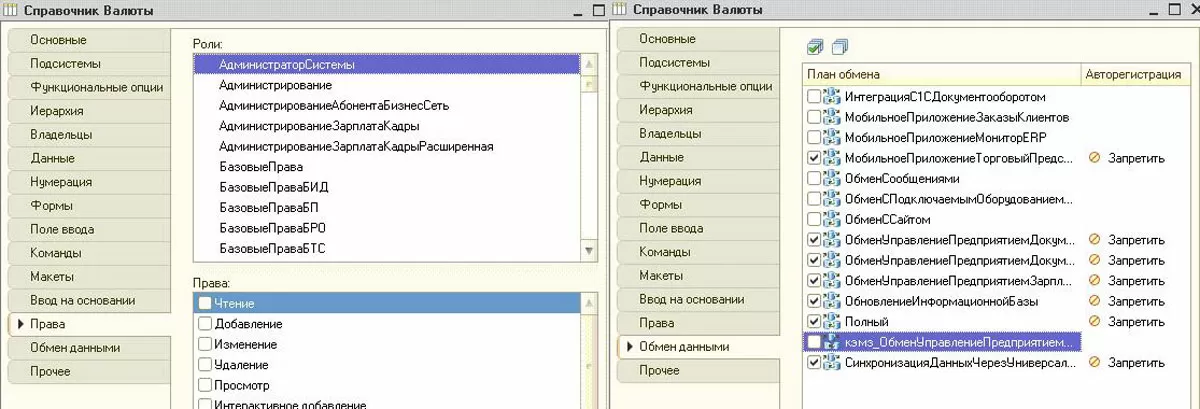 Подраздел «Права» отражает информацию о том, какие роли включают в себя доступ к справочнику, включая заполнение справочников, изменение и чтение. «Обмен данными» ознакомит, в каких планах обмена участвует справочник. Последняя вкладка включает в себя возможность перейти в модули для написания процедур и функций. Также там расположен перечень предопределенных значений справочника, к которым можно обращаться напрямую в коде.