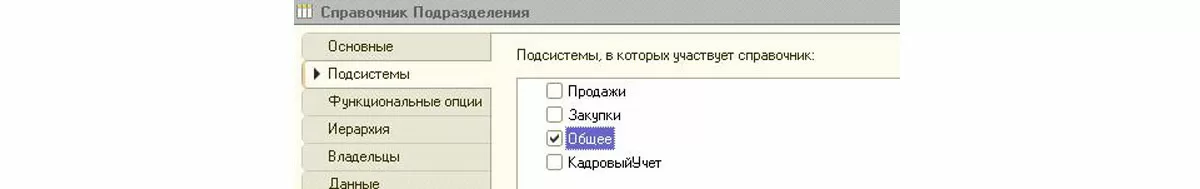 Далее нам необходимо добавить новый справочник в одну из подсистем, если мы хотим, чтобы пользователи могли видеть его в интерфейсе. Открываем вкладку «Подсистемы» и ставим галку напротив уже существующей подсистемы «Общее».