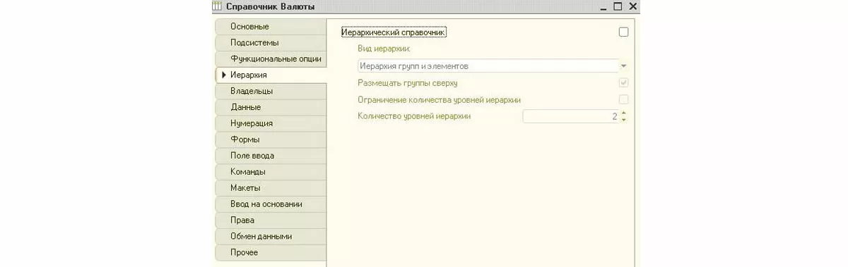 На вкладке «Функциональные опции» определяется функциональность с использованием справочника. Закладка «Иерархия» позволяет создавать вложенные элементы справочника. Иерархические виды справочников могут быть крайне полезными.