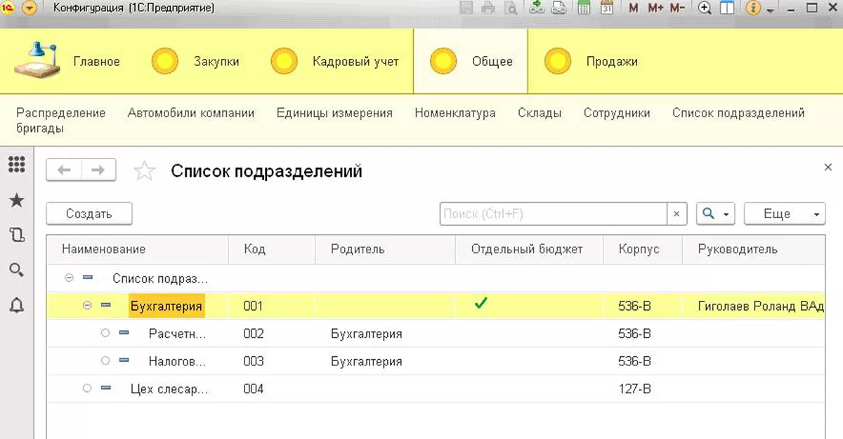 На этом создание демонстрационного справочника «Подразделения» закончено. Обновляем конфигурацию и запускаем систему вновь в режиме предприятие. В подсистеме «Общее» появилась функциональная клавиша «Список подразделений». Нажатие на нее открывает заданную нами форму списка справочника с возможностью добавления в нее элементов.