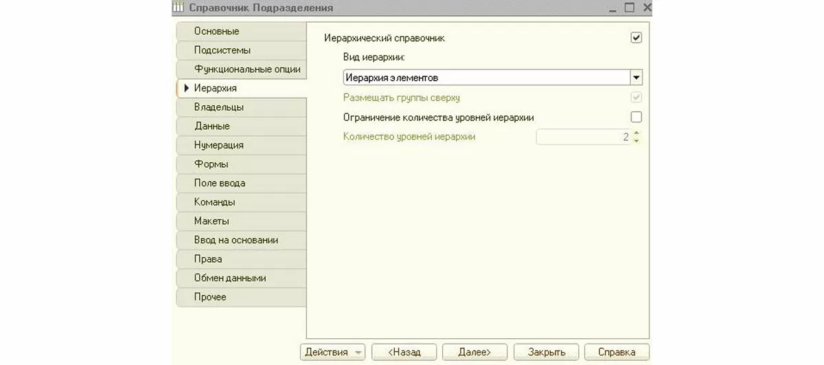 Наш новый справочник будет иерархическим, так как подразделения могут входить одно в другое. Групп подразделений на нашем предприятии не планируется, поэтому выбирается тип «Иерархия элементов». Ограничивать вложенность подразделений при этом мы не будем.