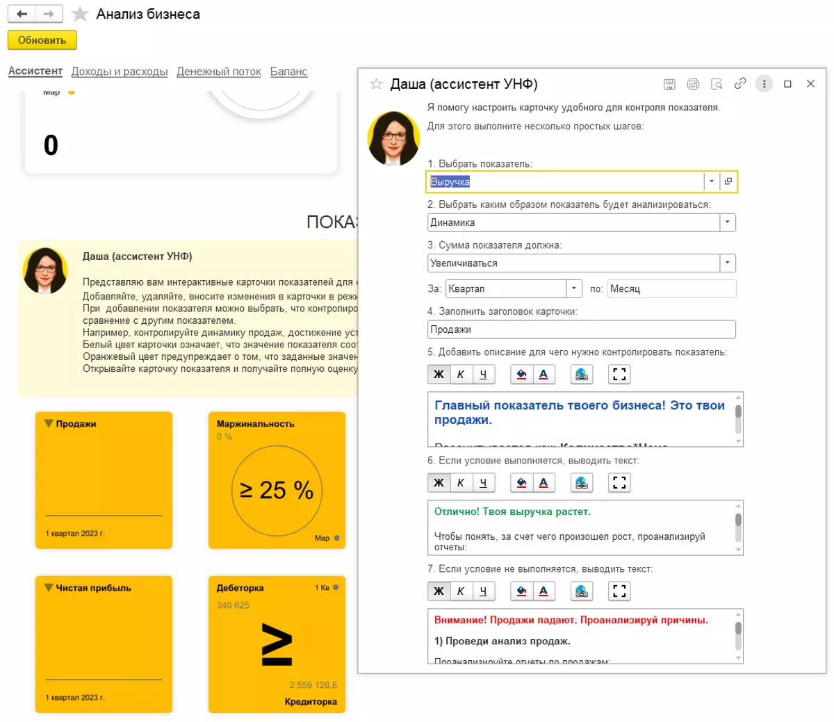Весомыми плюсами продукта являются его комплексность и удобный инструмент аналитики для руководителя со встроенным помощником-ассистентом Дашей.