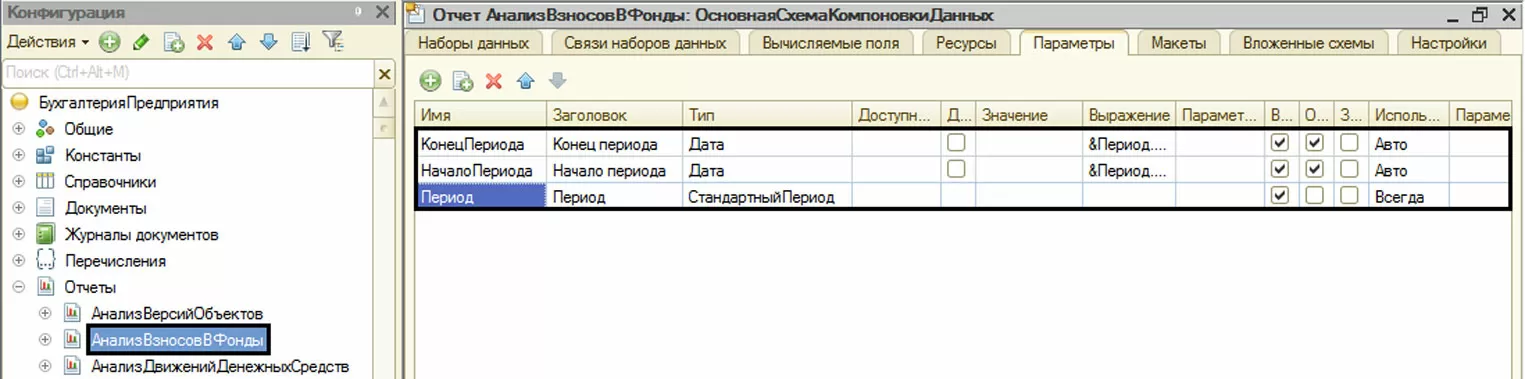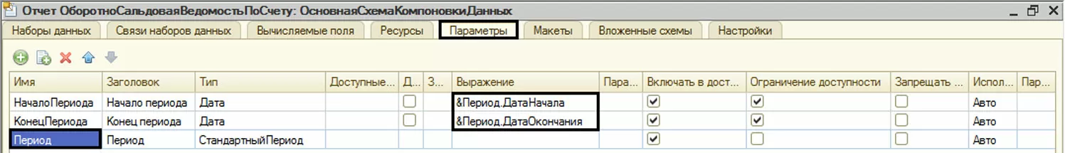 Перейдем на закладку «Параметры». НачалоПериода/КонецПериода – стандартные записи (и к ним добавляется еще один – «Период», с типом «СтандартныйПериод»). В колонке «Выражение» для них укажем выражения: &Период.ДатаНачала и &Период.ДатаОкончания, соответственно, и установим галочки – «Ограничение доступности».