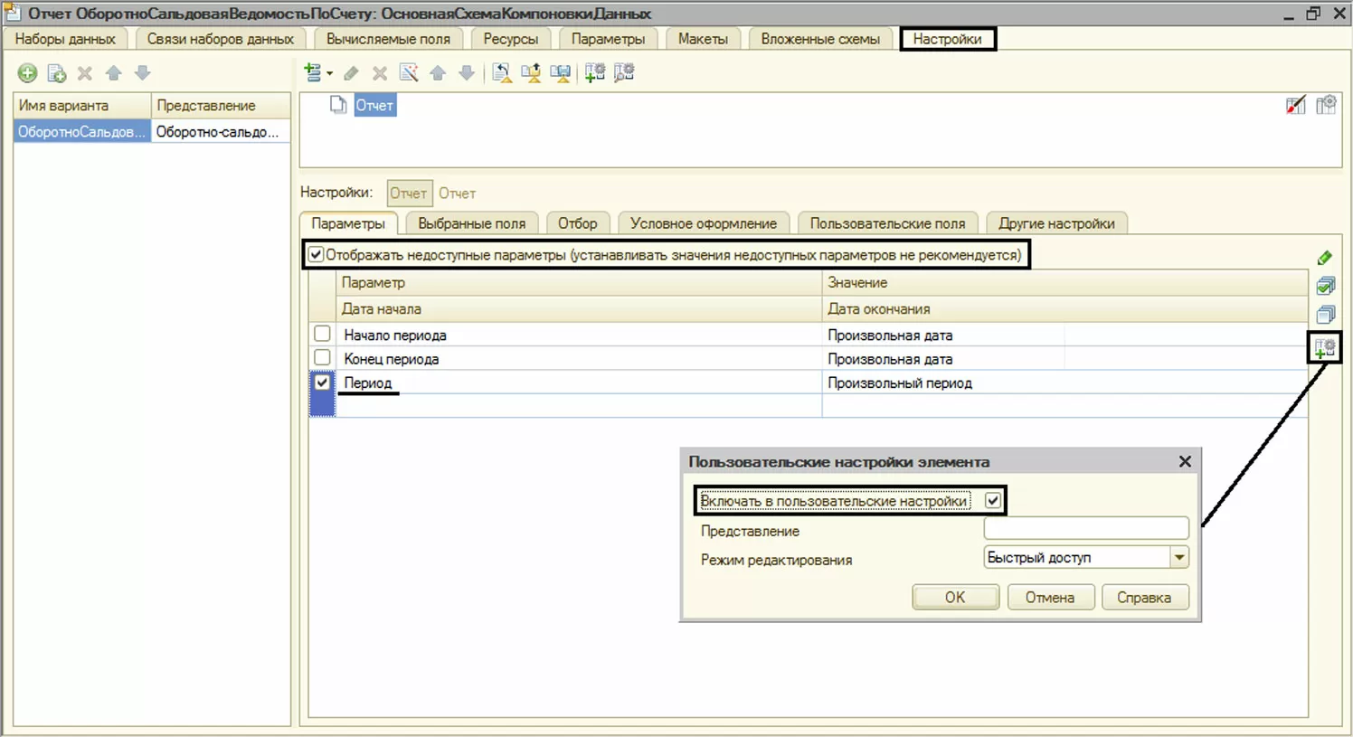 Перейдем в «Настройки», включим галочку «Отображать недоступные параметры» и откроем пользовательские настройки для нашего нового параметра – «Период». В открывшемся окне устанавливаем галочку «Включать в пользовательские настройки».