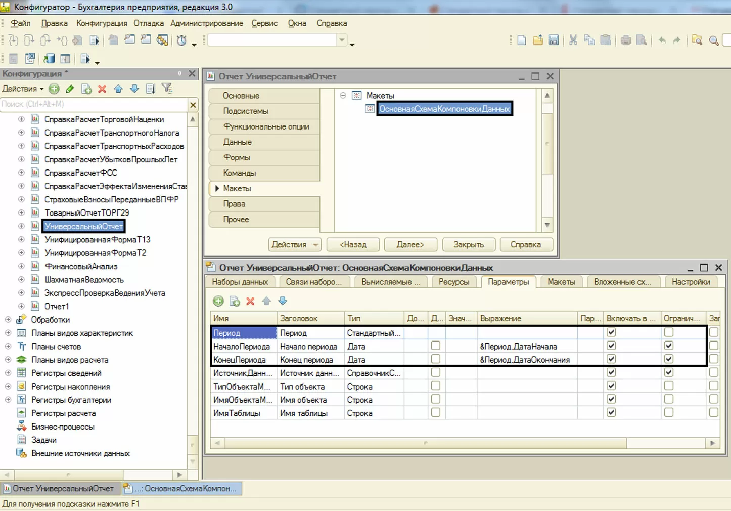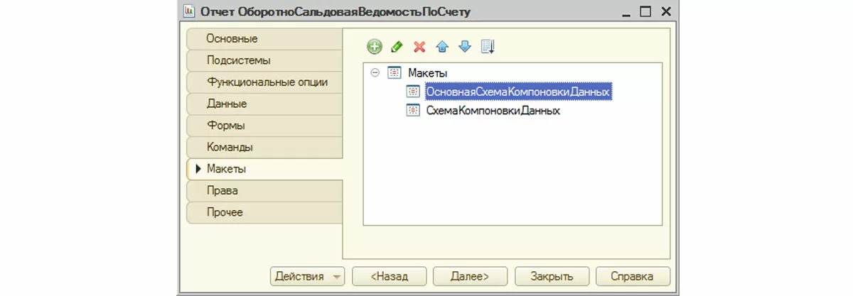 Откроем конфигурацию и рассмотрим свойства отчета. Перейдем в «Макеты», где мы увидим раздел для установки параметров «Схемы компоновки данных».