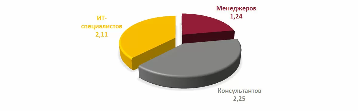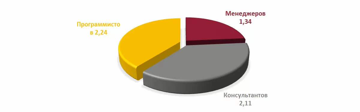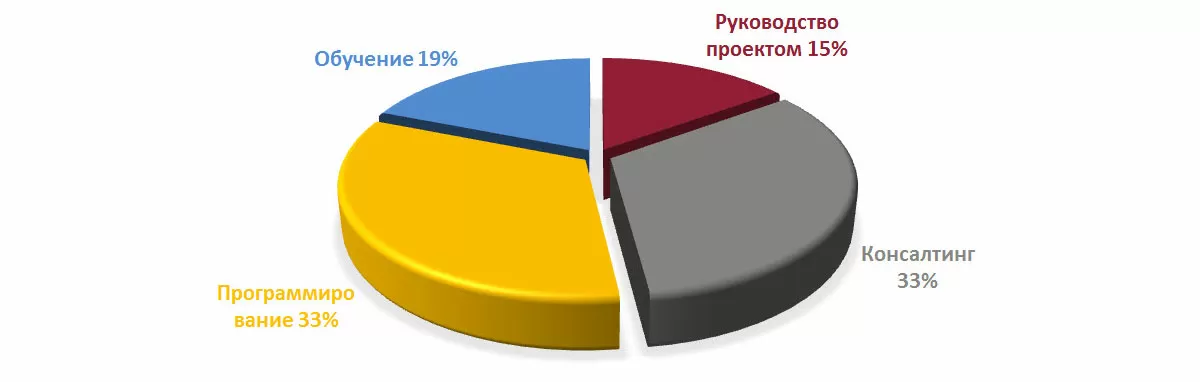Средние значения по данным 136 реализованных проектов внедрения системы класса ERP (по публичным данным фирмы 1С) за 2018 год.