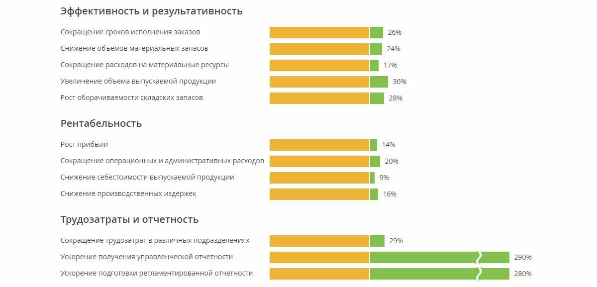Примеры реальных проектов внедрения на базе ERP от победители конкурса 1С:Проект годаЭффект от внедрения продуктов 1С класса ERP