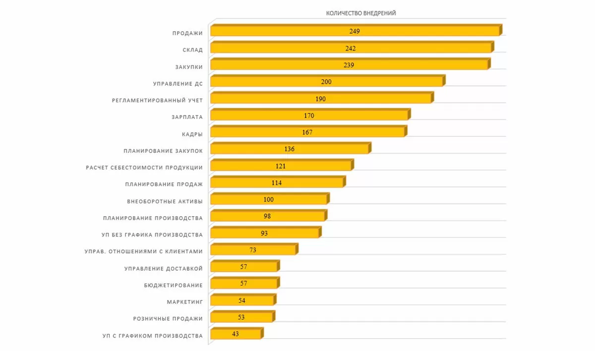 Данные фирмы 1С по внедренным подсистемам активных проектов на 14.09.2016 по 629 отчетам о ходе внедрения.