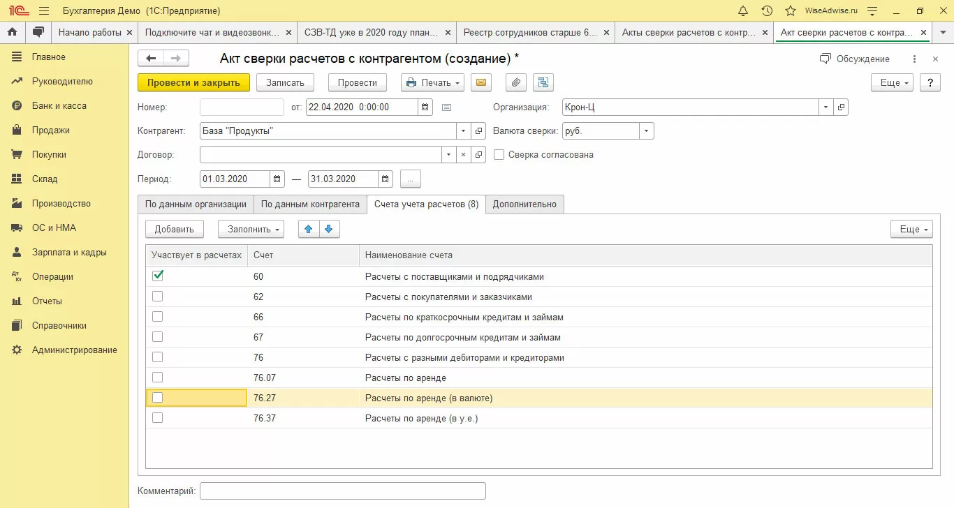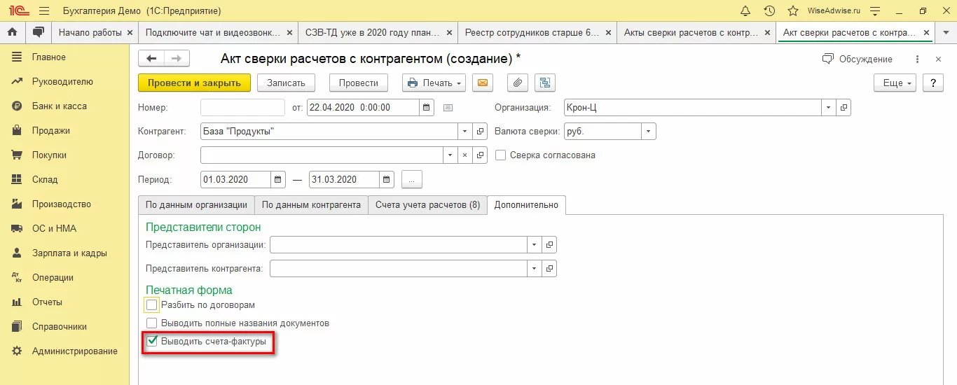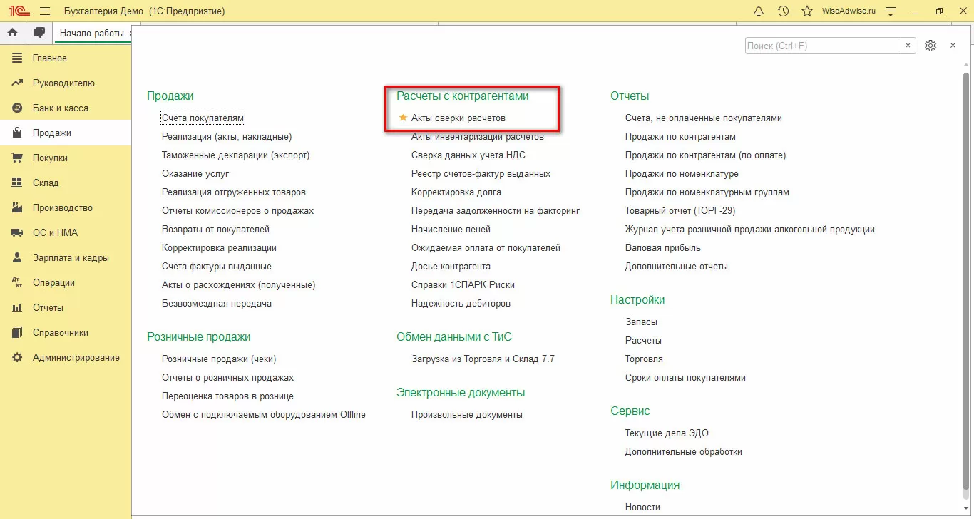 Где найти акт сверки в программе 1С?