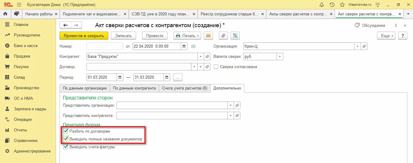 В том же разделе дополнительных настроек существует третья опция – возможность сформировать отчет в разрезе договоров, для большей точности с выводом полного названия документов.