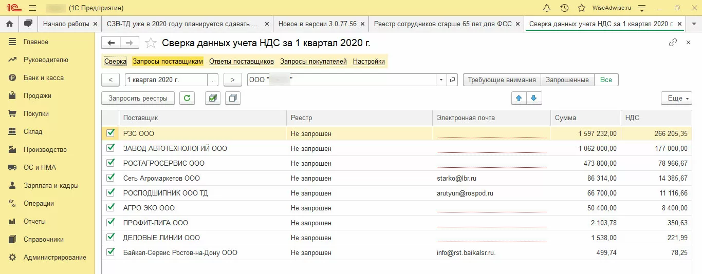 После активации настроек необходимо перейти в отчет и открыть вкладку «Запросы поставщикам». Выбрав «Все», мы увидим список контрагентов, где следует выбрать период, контрагента, указать его электронную почту и кликнуть «Запросить реестры».