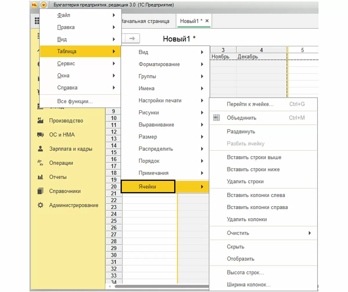 Мы можем выполнять с ячейками любые действия, как с обычными таблицами в Excel или таблицами в документах Word – вставлять и удалять строки, объединять ячейки, скрывать и пр. («Файл-Таблица-Ячейки»).