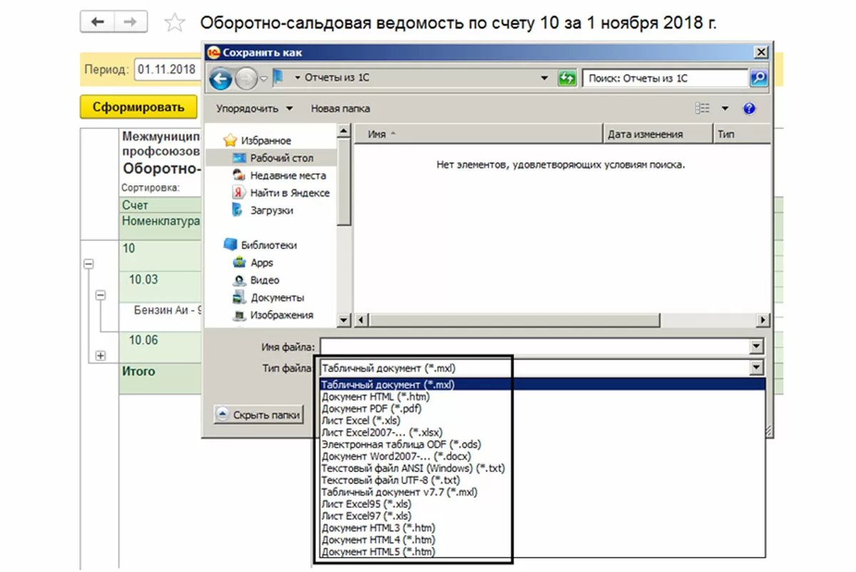 При сохранении табличного документа можно выбрать различные форматы, как в собственном формате – 1С-mxl, так и экспортировать в другие форматы – лист Excel, документ PDF или формат mxl-табличный документ v7.7 (для совместимости с версией платформы 7.7) и другие форматы.