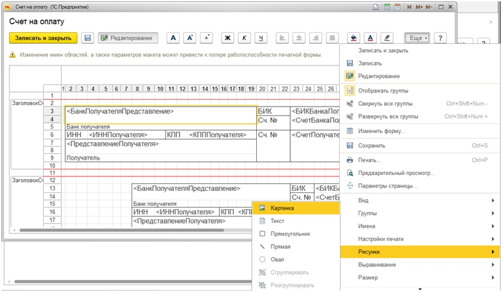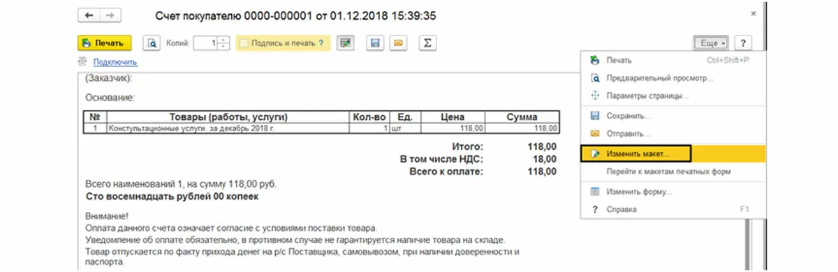 В каждом документе имеется макет его печатной формы. Открыв печатную форму, нажав кнопку «Еще» и выбрав команду «Изменить макет», мы самостоятельно можем внести в него коррективы, не прибегая к помощи программиста. Теперь такая возможность доступна в пользовательском режиме 1С.