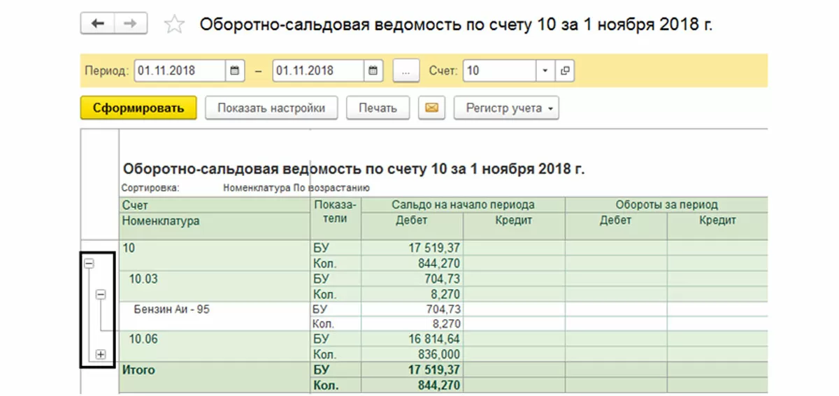 Используя эти принципы, созданы все табличные формы в программе, например, отчет Оборотно-сальдовая ведомость по счету. С помощью редактора табличных документов в 1С можно создавать как небольшие табличные документы, так и документы, имеющие сложную структуру.