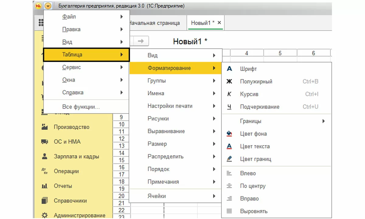 Обработка табличной части также может быть сделана через меню «Файл-Таблица». Выбрав пункт «Форматирование», мы также можем настроить шрифт, выравнивание, границы.