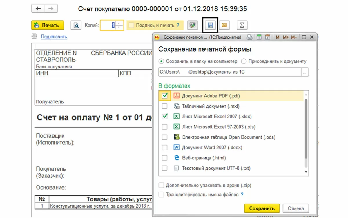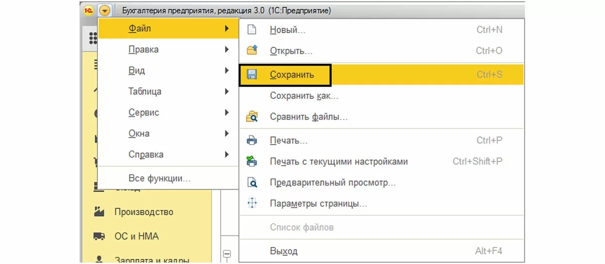 Сформировав документ, его можно сохранить в файл на диске для отправки по электронной почте, переноса на другой компьютер или флешку и т.д. Для этого выберем команду «Сохранить» в пункте меню «Файл».