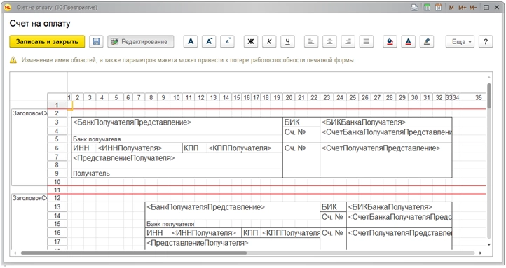Макет печатной формы документа «Счет». Мы видим, что в одних ячейках содержится только текст, в других – имена параметров, которые необходимо будет задать при заполнении документа.
