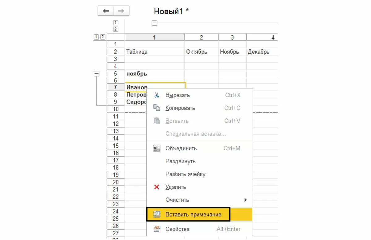Заполнение табличного документа в 1С 8.3 предусматривает создание примечаний для ячейки или их группы. Они буду помечены треугольничком в правом верхнем углу, при наведении мышки на который будет всплывать окошечко с текстом, поясняющим данные ячеек. Чтобы их создать, надо вызвать нажатием правой кнопки мышки команду контекстного меню – «Вставить примечание» или через пункт меню «Файл-Таблица-Примечание».