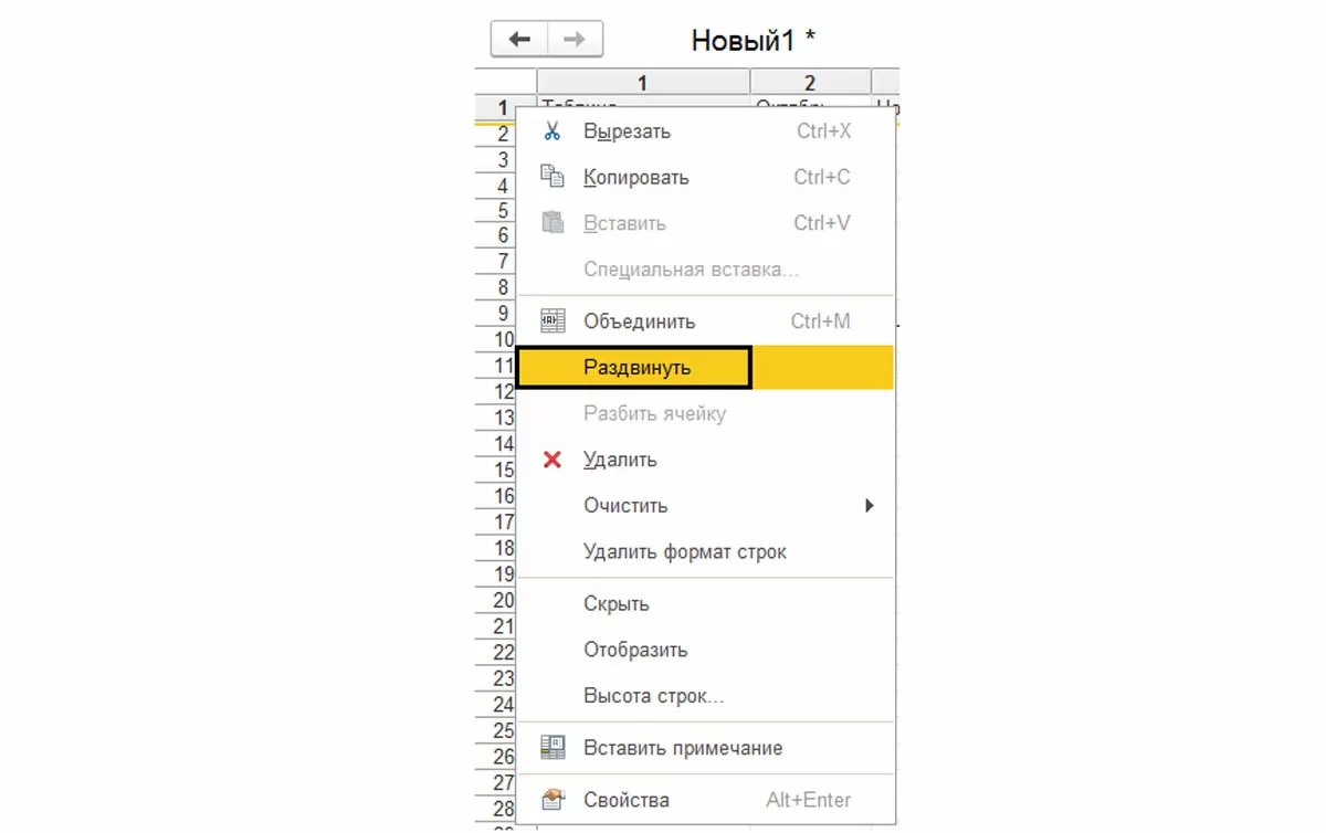 Для удобства при работе с табличным документом можно пользоваться контекстным меню, нажав на ячейке или выделенному фрагменту правой кнопкой мышки. Например, выбрав команду «Раздвинуть», мы добавляем строки выше текущего положения. Здесь же мы можем объединить или разбить ячейки, удалить, очистить, настроить высоту строк, выбрав соответствующие команды.