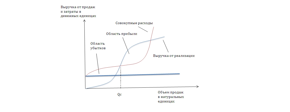 Вот это и есть порог безубыточности или рентабельности, критический объем продаж или «мертвая точка», как предложил именовать финансовую точку безубыточности знаменитый бухгалтер И. Шер, то есть тот минимум, который обеспечивает безубыточность хозяйствования. Превышение Qc означает генерирование прибыли.