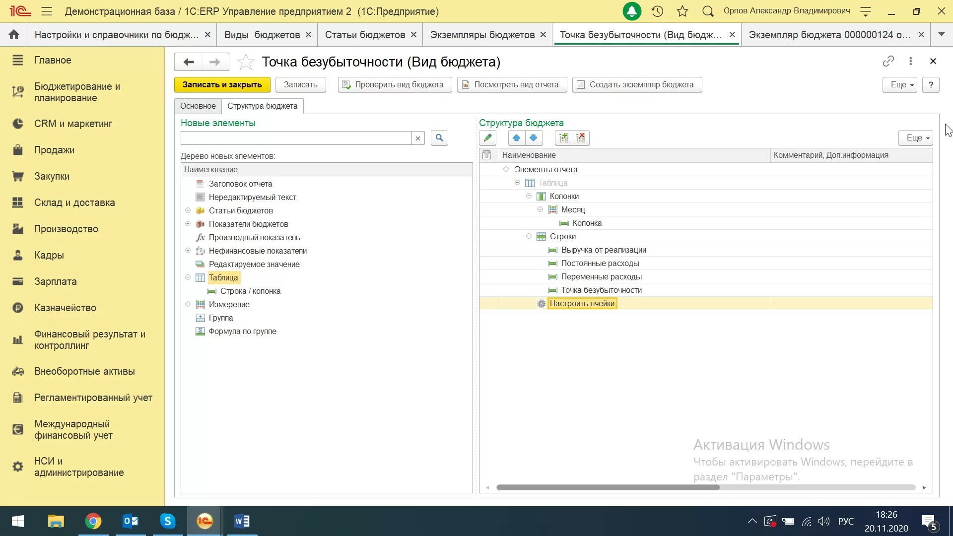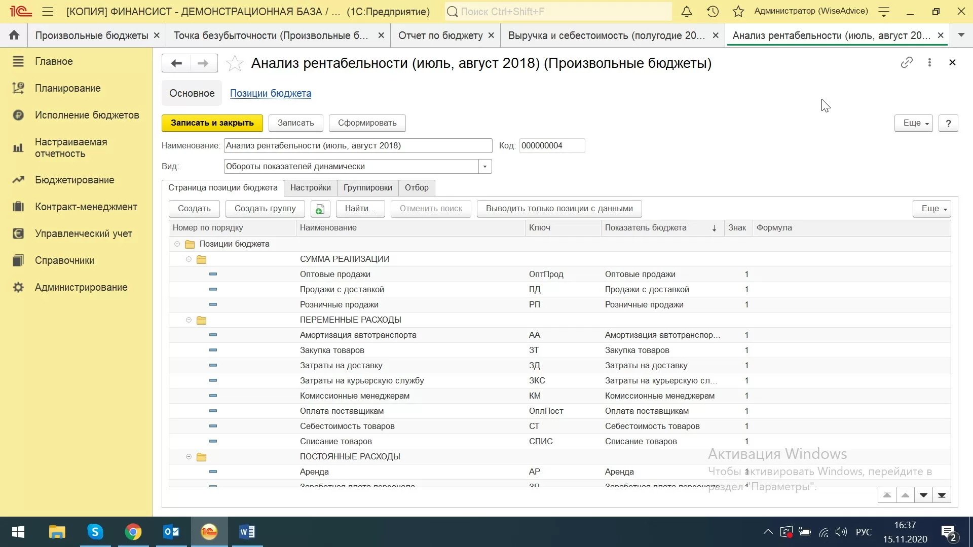 Таким образом, система произвольных бюджетов позволяет создавать различные управленческие отчеты, анализировать критические точки рентабельности, маржинальность, рассчитывать операционный рычаг (леверидж), запас финансовой прочности и многие другие ключевые показатели хозяйственной деятельности предприятия. Произвольный бюджет – это конструктор, который сочетает в себе неограниченное количество схем, статей, демонстрирует данные по оборотам и на их основе рассчитывает необходимые показатели.
