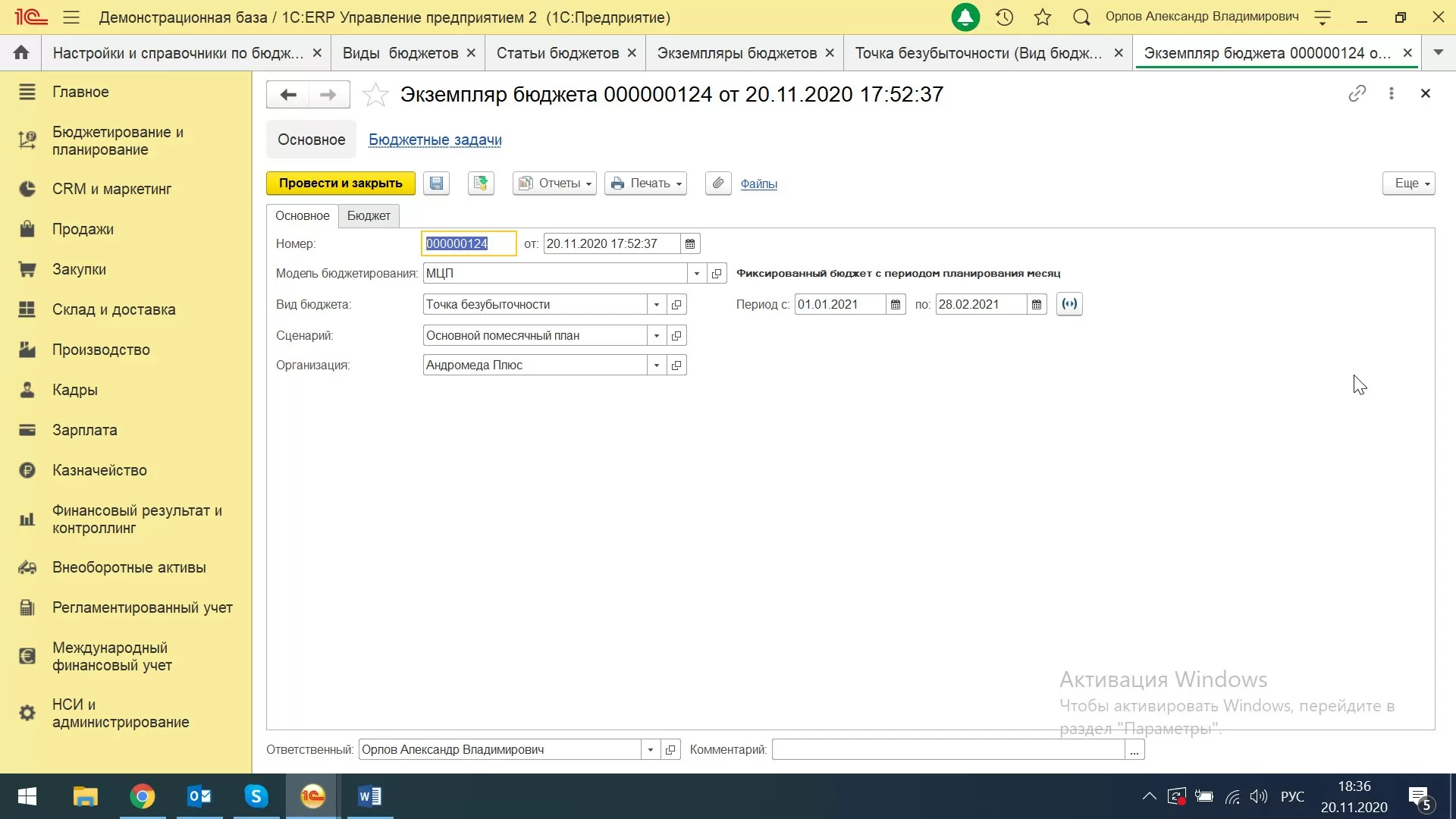 Создаем документ «Экземпляр бюджета» через кнопку «Создать экземпляр бюджета» и через форму «Вид бюджета». Это также можно сделать в ручном режиме путем перехода в раздел «Бюджетирование и планирование-Бюджеты-Экземпляры бюджетов».