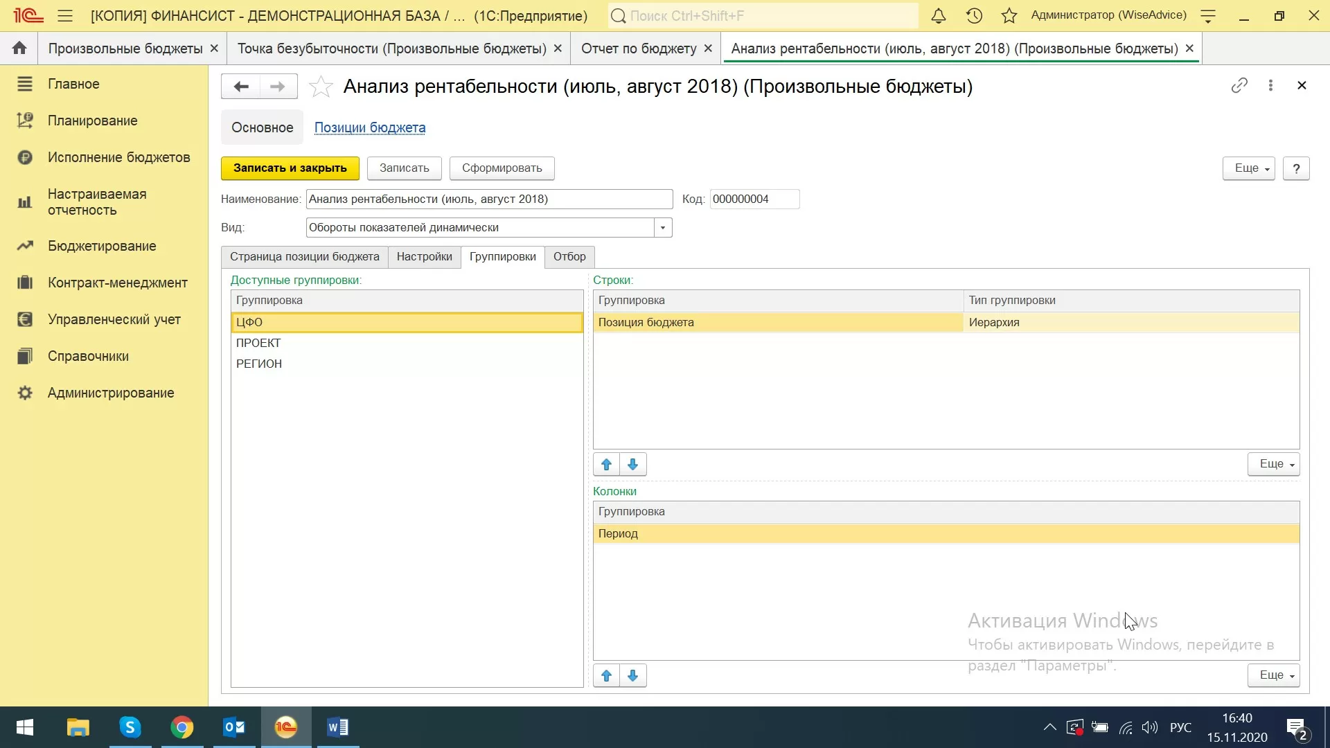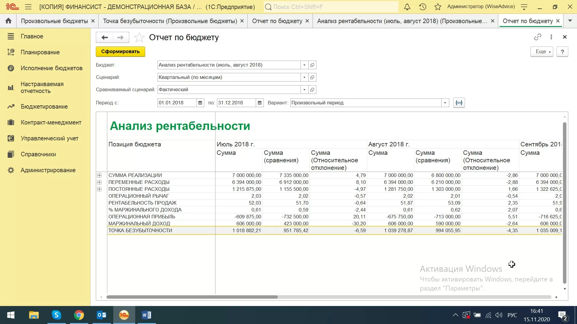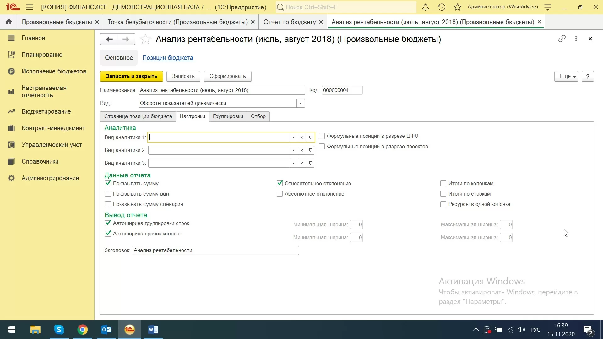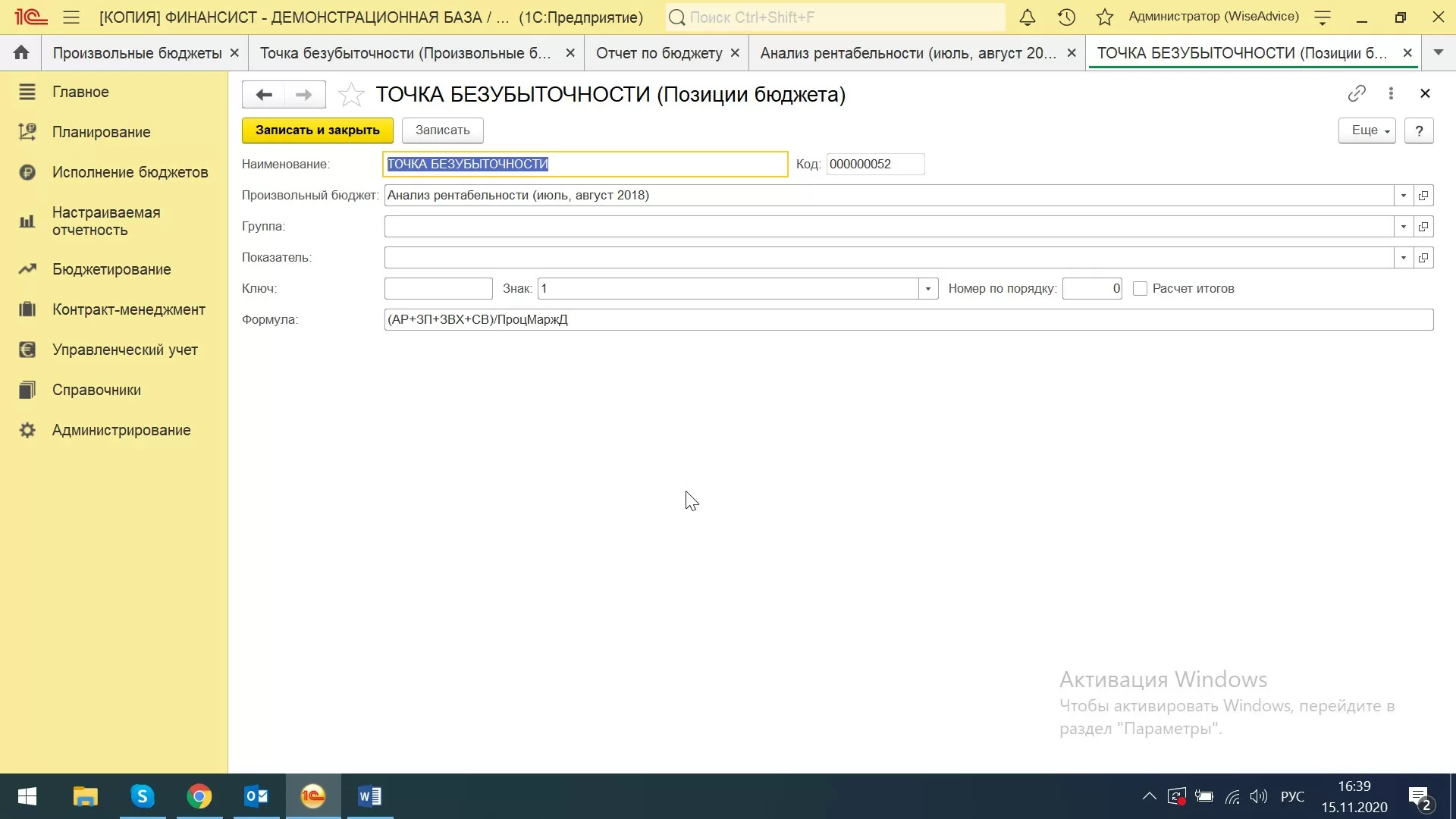 В системе WA:Финансист рассчитать точку безубыточности можно через раздел «Настраиваемая отчетность-Произвольные бюджеты».