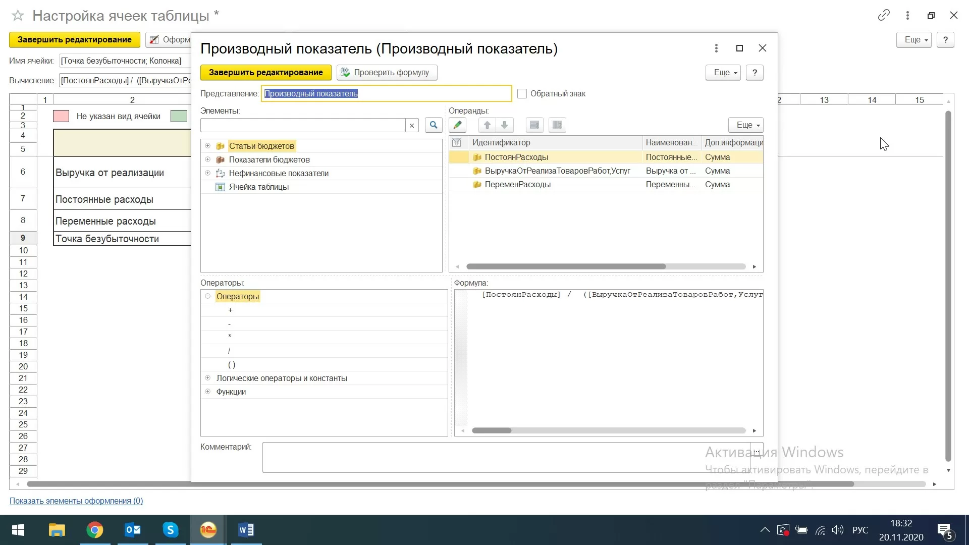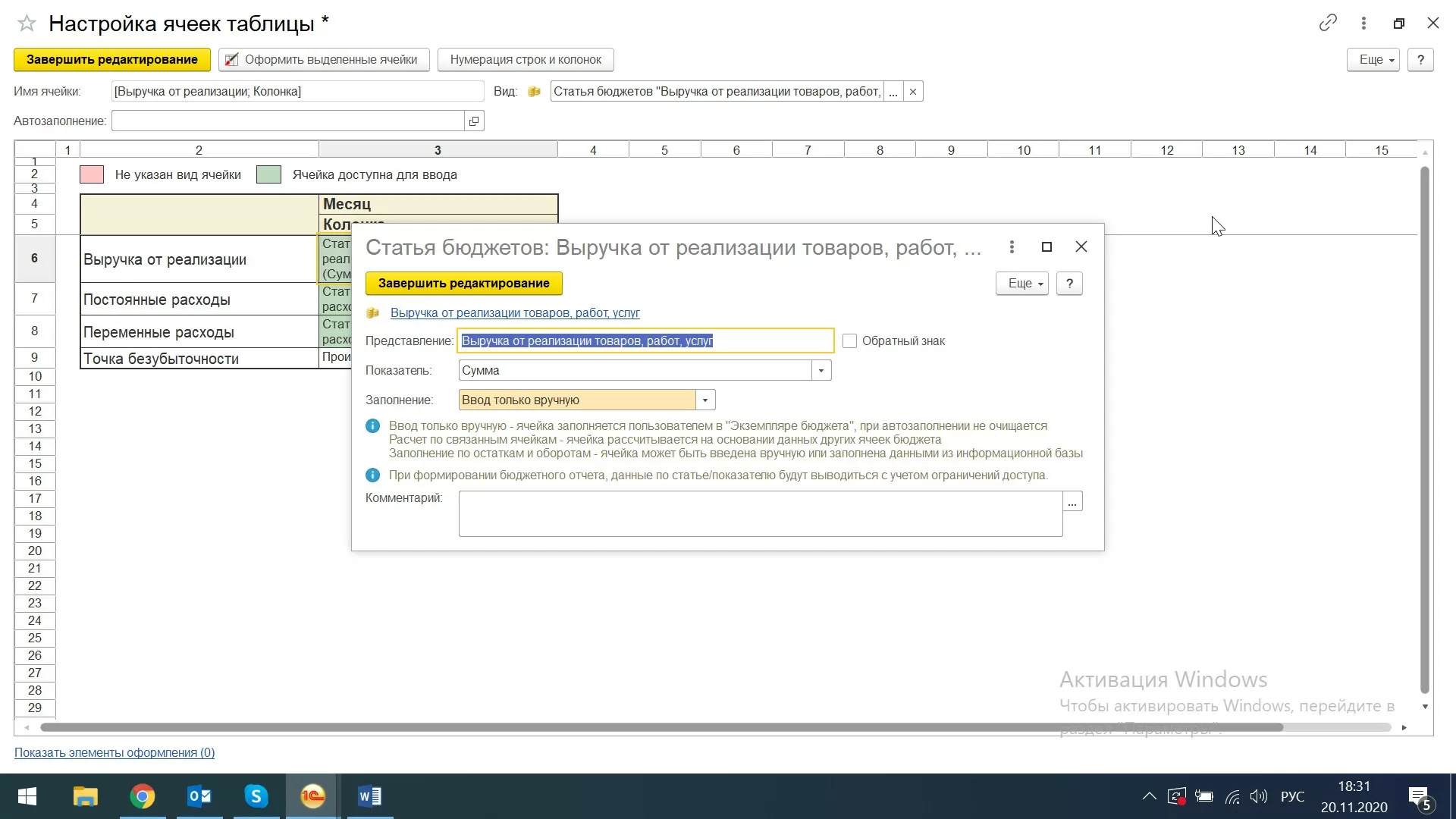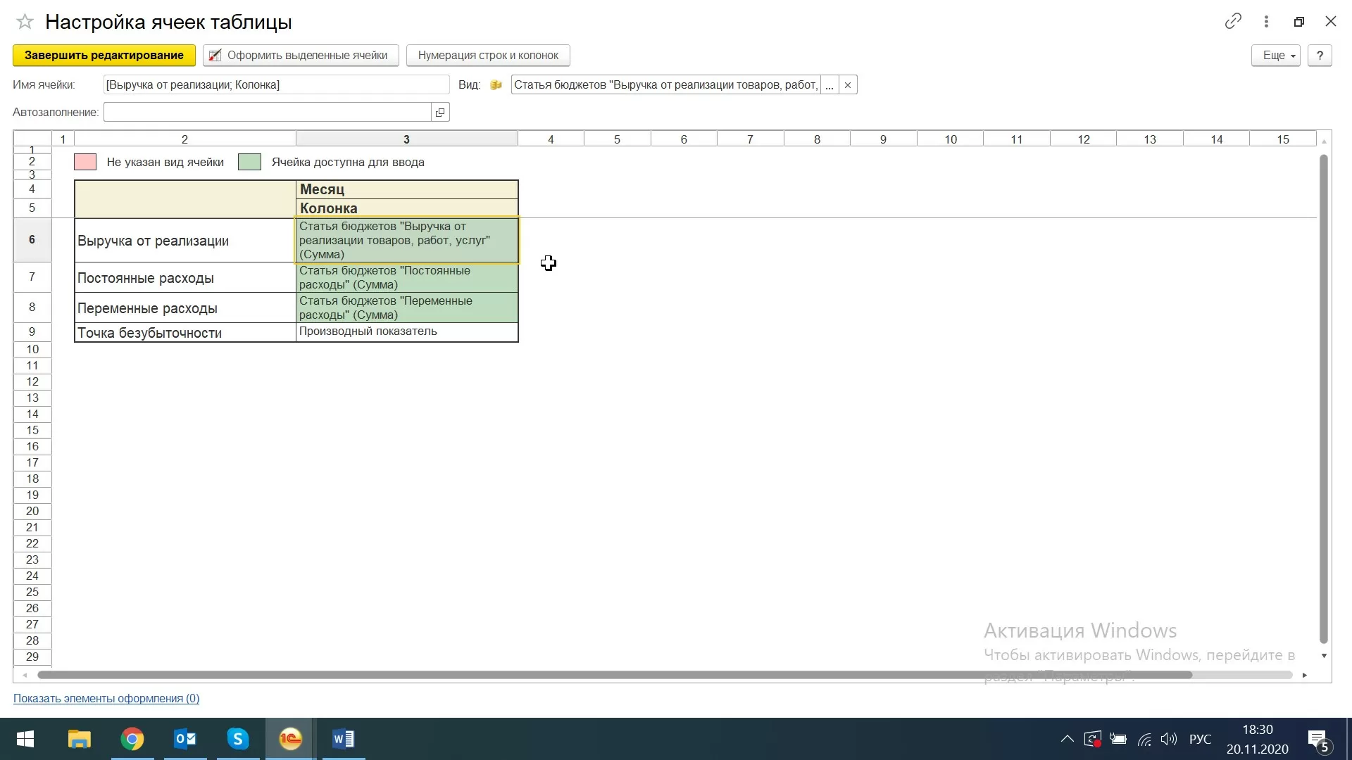 Автоматизация расчета точки безубыточности на базе 1С:ERPОткрывается окно «Настройка ячеек таблицы».