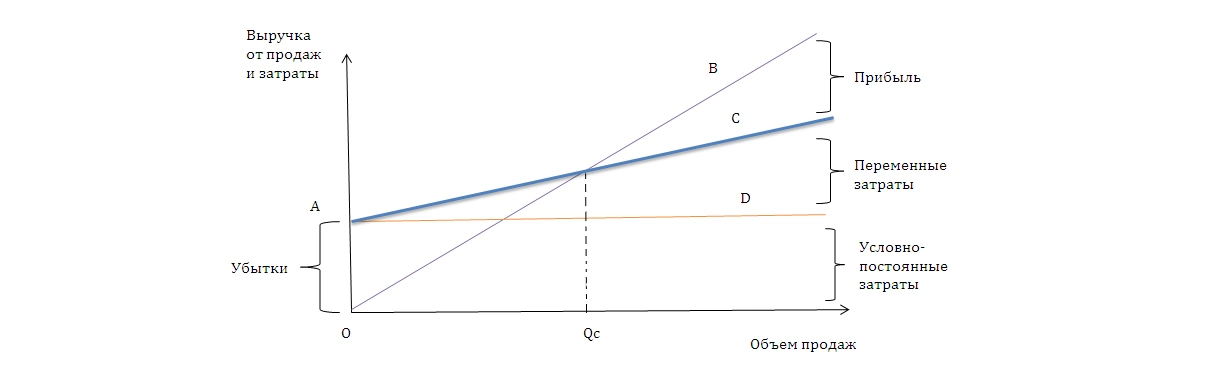 - Точка пересечения линий ОВ и АС определяет тот объем продаж Qc, при котором выручка становится равна нашим совокупным затратам.