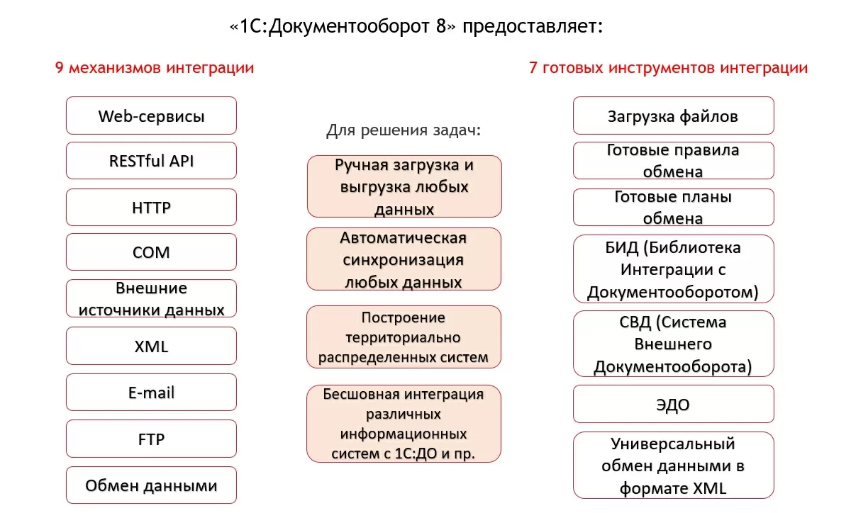Еще одна из важных особенностей «1С:Документооборот 8 КОРП» – это решение прекрасно интегрируется с любыми другими решениями на платформе 1С.