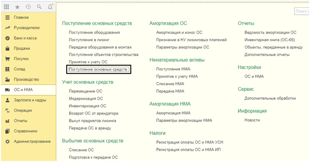 Отразим приобретение транспортного средства. Для основных средств, не требующих монтажа, можно воспользоваться документом «Поступление основных средств», который служит для одновременного отражения поступления и принятия к учету основных средств (ОС). Документ находится в разделе «ОС и НМА» – группа документов «Поступление основных средства», гиперссылка «Поступление основных средств».