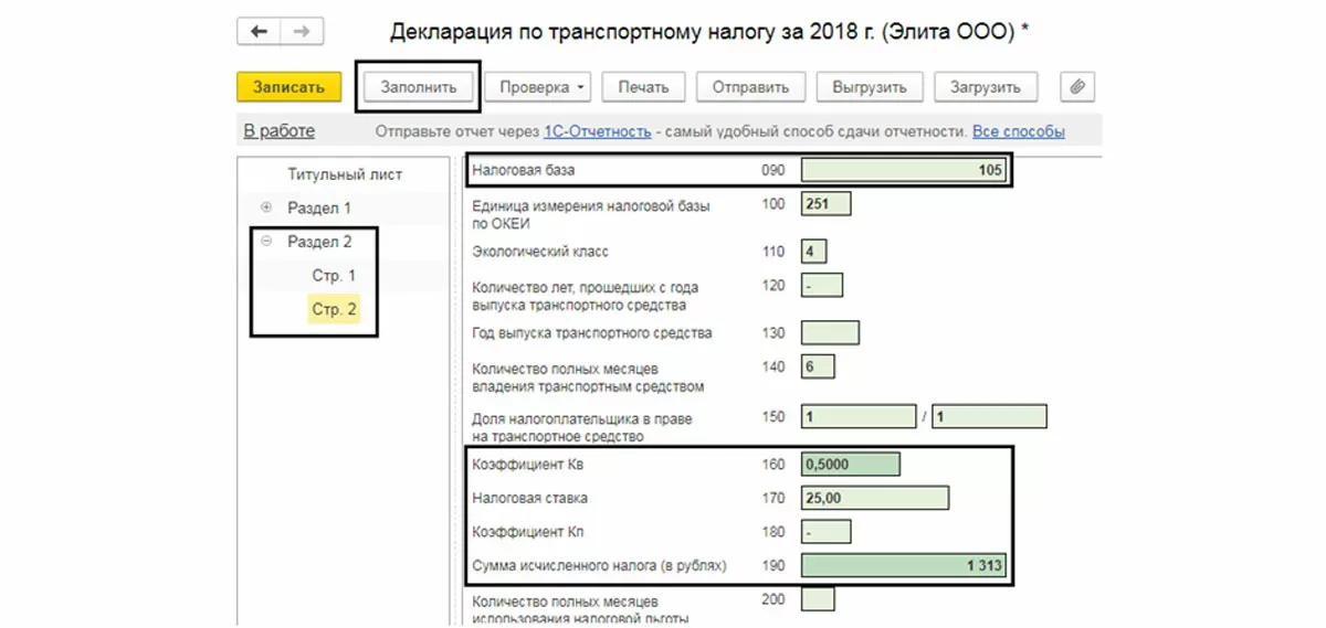 Нажав кнопку «Заполнить», проверяем данные в декларации. В Разделе 2 отдельно на страницах отражены данные расчета отдельно по каждому транспортному средству. Так, мы видим данные по расчету налога на наше транспортное средство (с учетом изменений даты).