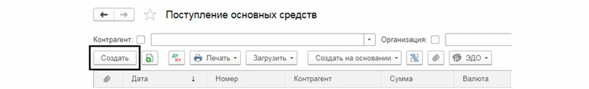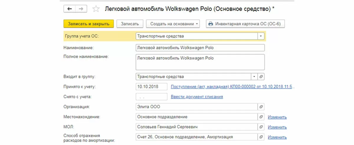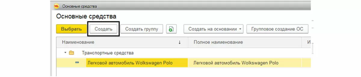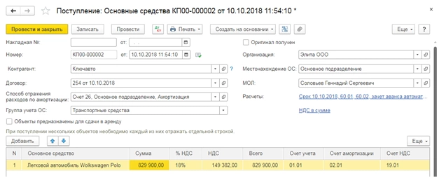 Рассмотрим пример. ООО «Элита» приобрела легковой автомобиль Wolkswagen Polo стоимостью 829900 руб. у поставщика «Ключавто». Отразим в программе поступление автомобиля. Создадим документ «Поступление основных средств» (кнопка «Создать» в журнале документов).