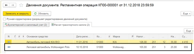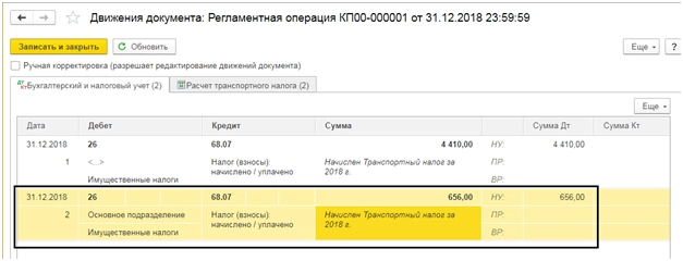 После проведения документа, нажав на гиперссылку «Расчет транспортного налога», можно посмотреть бухгалтерские проводки и сам расчет.