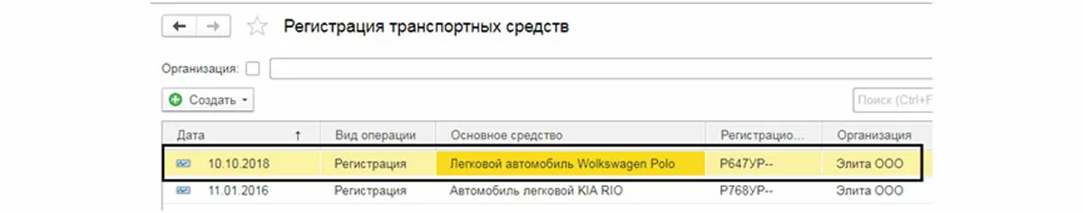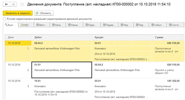 При проведении документа сформировались проводки, и наш автомобиль поставлен на баланс.