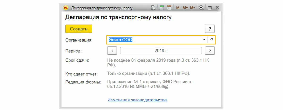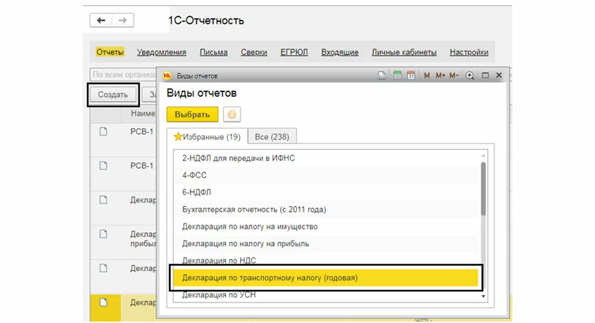 Сформируем декларацию и отправим ее в налоговую. Декларация доступна в меню «Отчеты» – «1С-Отчетность» – «Регламентированные отчеты». Жмем «Создать» и выбираем нужную декларацию. В нашем примере – «Декларация по транспортному налогу (годовая)», и формируем бланк.