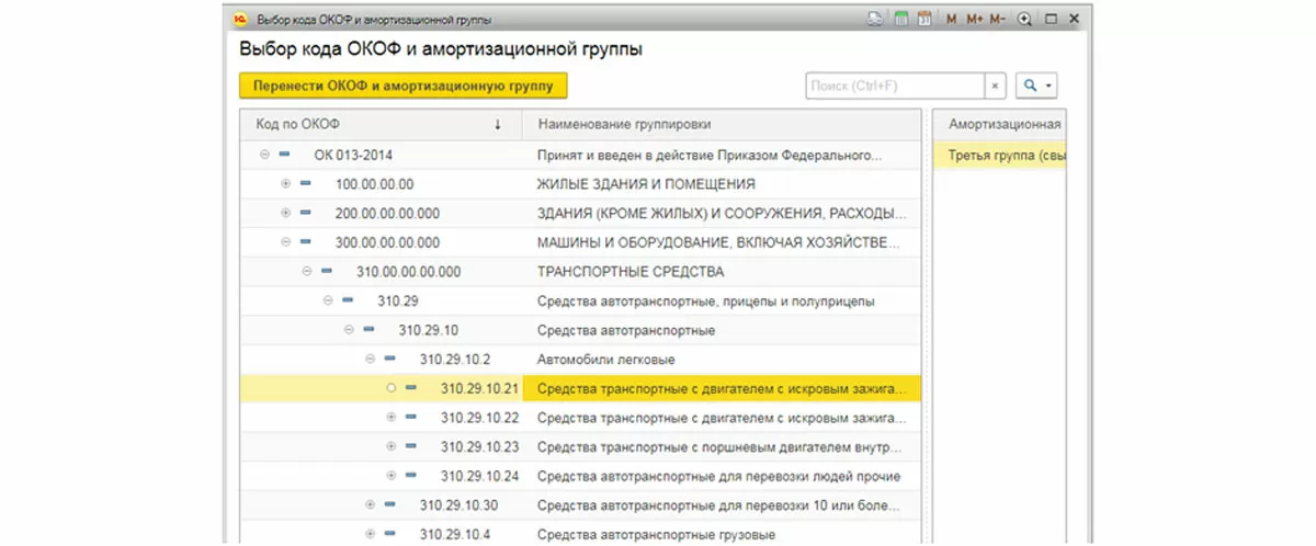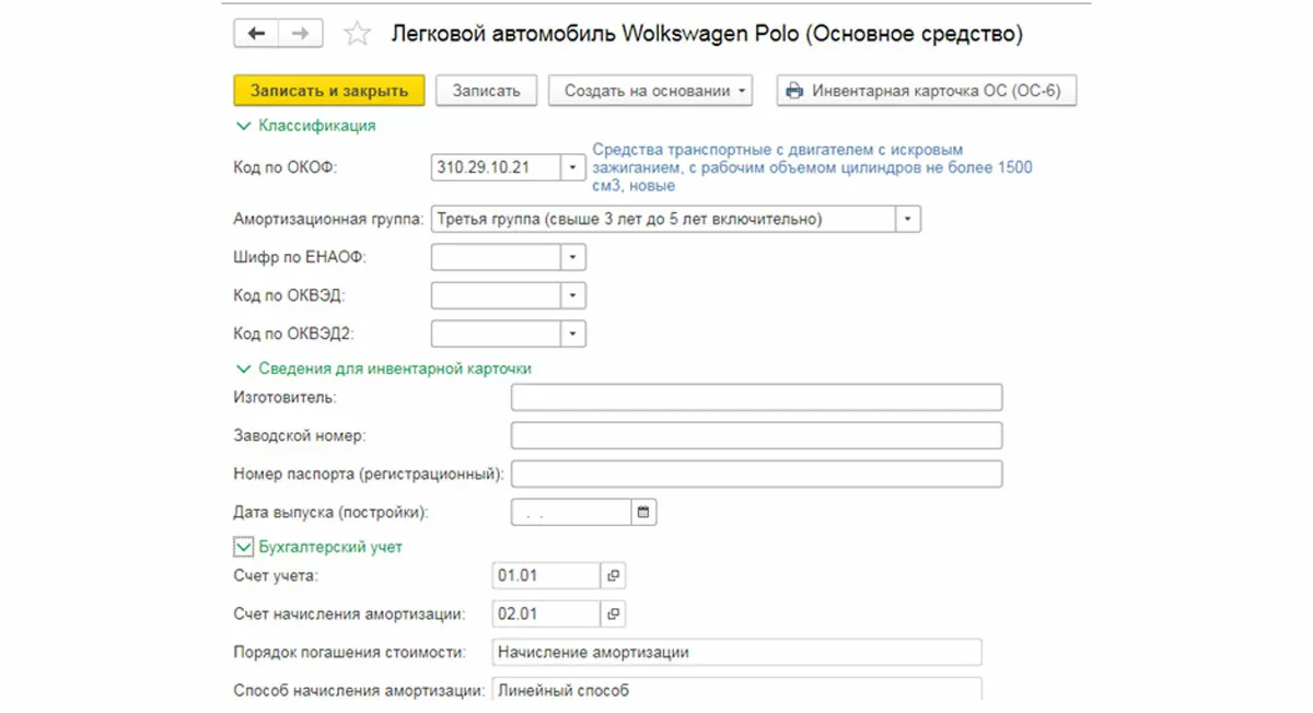 Обратите внимание, что для формирования инвентарной карточки и дальнейшего начисления амортизации необходимо заполнить все поля карточки ОС ниже – изготовитель, заводской номер, регистрационный номер и так же классификатор по ОКОФ, определяющий амортизационную группу.
