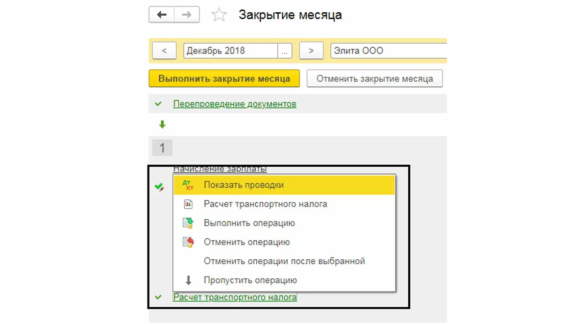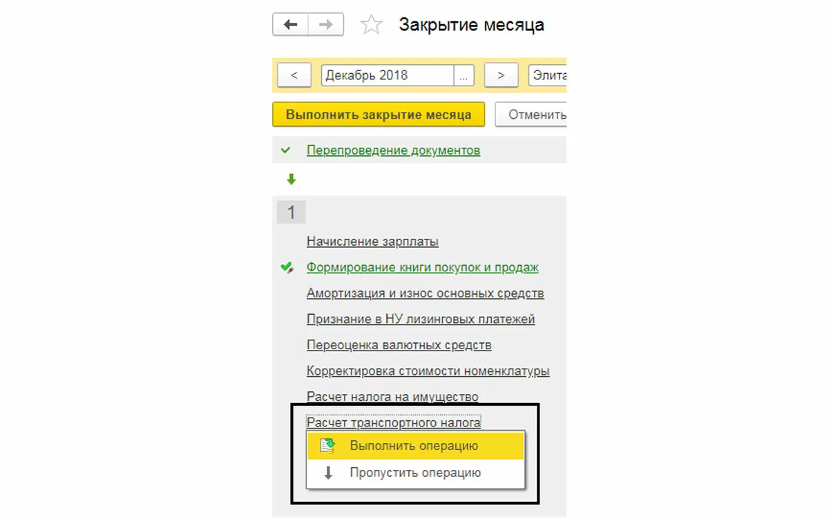 Для проверки начисления налога, установим в документе месяц «Декабрь» и выполним только одну операцию – «Начисление транспортного налога», чтобы не нарушать последовательность других операций.