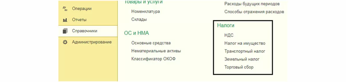 Первый шаг в настройке – зарегистрируем наше средство. Для этого идем в «Справочники», пункт «Налоги».