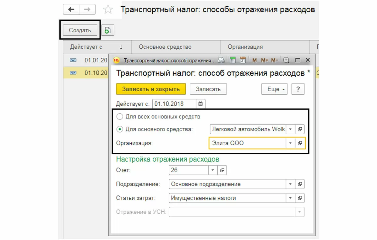 Для отражения налоговых расходов в журнале «Способы отражения», в открывшемся окне, по кнопке «Создать» задаем необходимые параметры. При этом можно задать для всех транспортных средств одну настройку или отразить для каждого индивидуальную статью расходов, что актуально, когда у организации ведется учет по разным подразделениям.