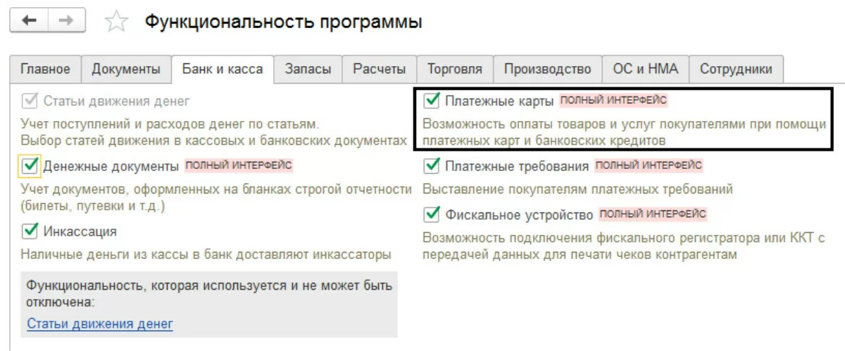 На закладке «Банк и касса» необходимо установить галочку «Платежные карты». Данный функционал включает возможность проводить операции с использованием платежных карт и банковских кредитов.