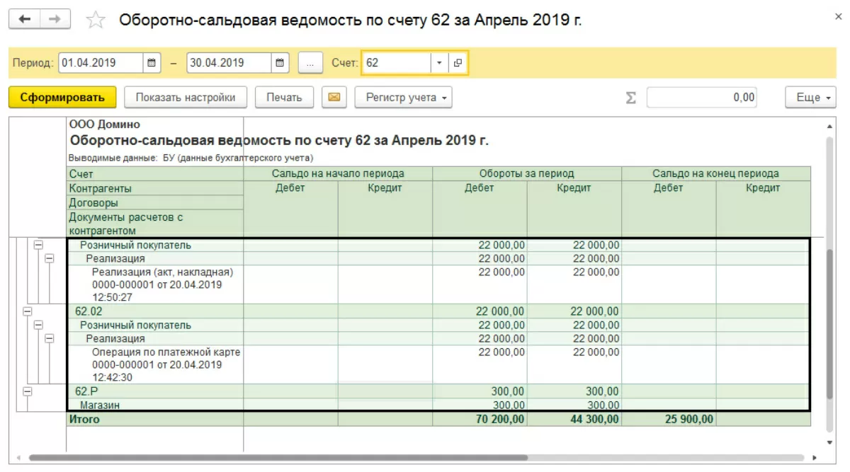 При формировании оборотно-сальдовой ведомости по счету 62 «Расчеты с покупателями и заказчиками», необходимо обратить внимание, чтобы в разрезе субконто все обороты были закрыты по субсчетам. При использовании счета 62.02 «Расчеты по авансам полученным» сальдо не должно быть.