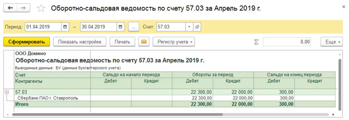 Сформировав оборотно-сальдовую ведомость по счету 57.03 «Продажи по платежным картам», мы увидим суммы поступивших оплат с помощью платежных карт за период и остаток сумм, не перечисленных на расчетный счет организации.
