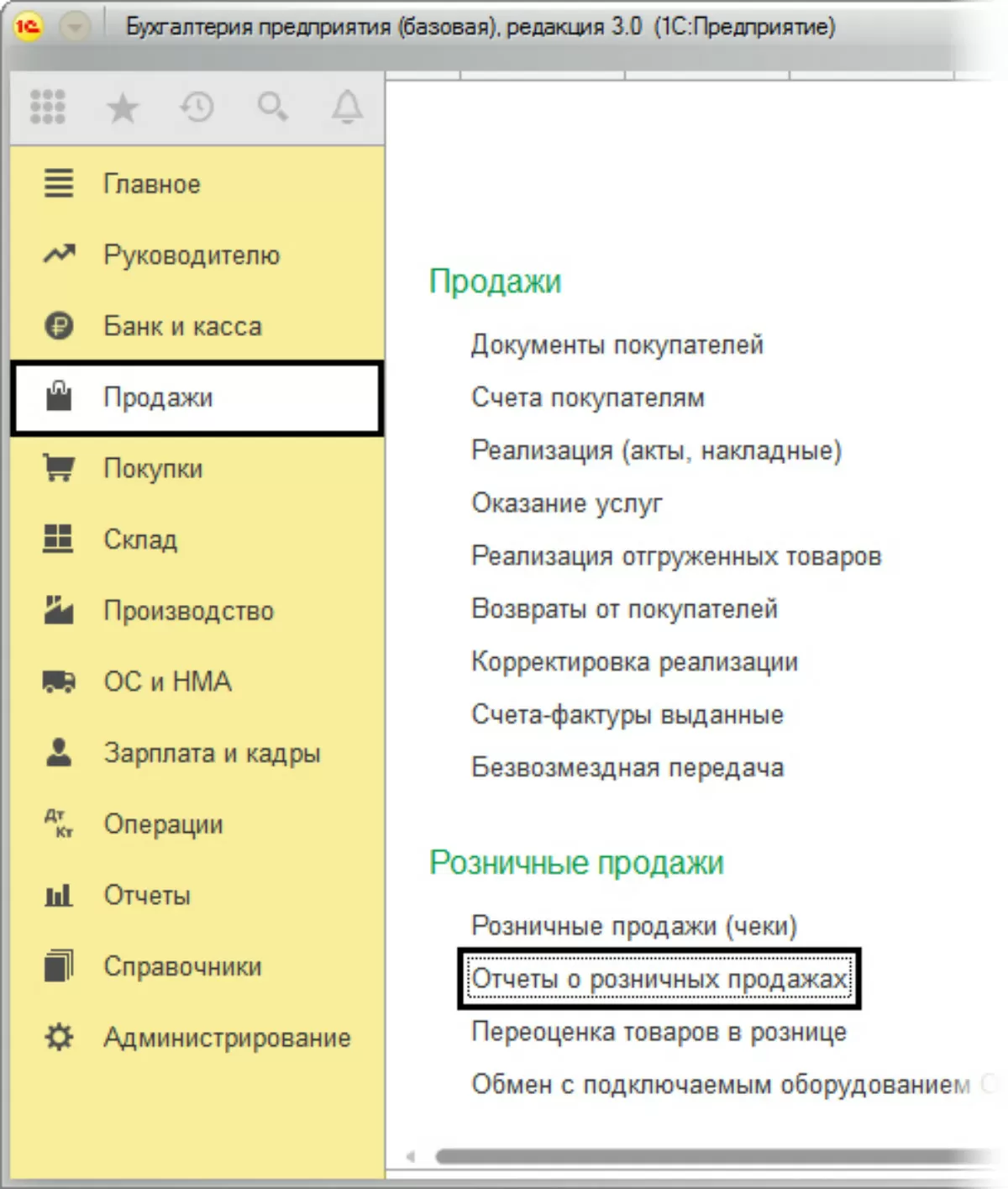 При отражении розничных продаж в автоматизированной торговой точке используется документ «Отчет о розничных продажах», в разделе меню «Продажи-Розничные продажи».